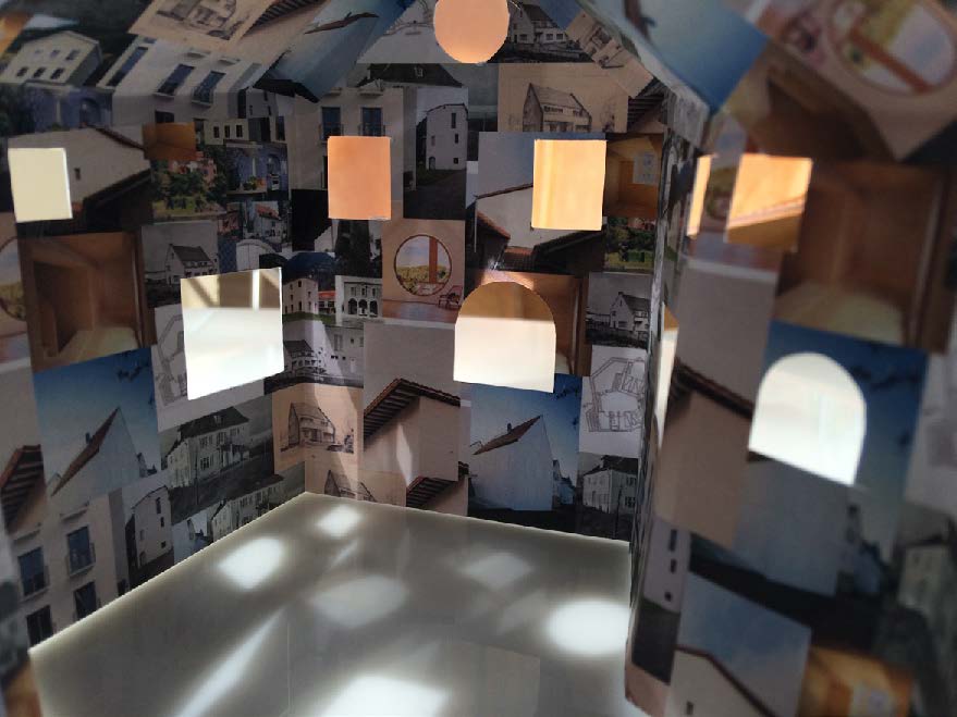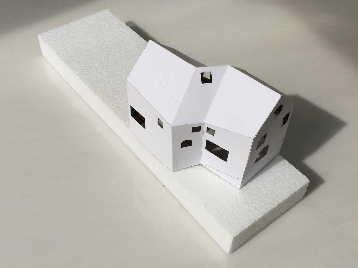 Ein Blick durch die Öffnungen des weissen Modells zeigt, dass Bauherrenwünsche, Standort und wirtschaftliche Einschränkungen den Entwurfsprozess beeinflussen.
