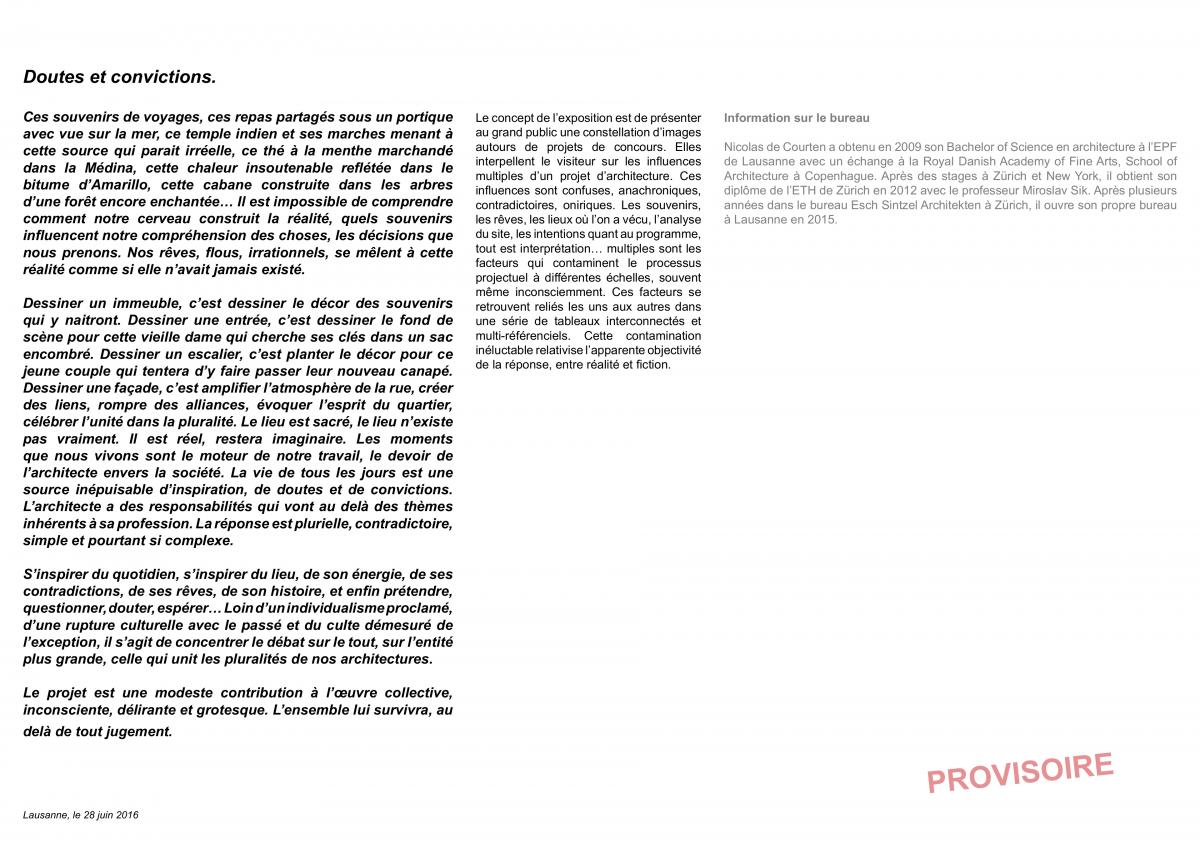 Nicolas de Courten aus Lausanne zeigt – anhand einer Kollektion von Bildern von aktuellen Projekten – die verschiedenen Einflüsse, die auf ein Architekturprojekt einwirken und es verändern können: Träume, Orte, Situationsanalysen, Interpretationen. Zwischen Realität und Fiktion – zeigt de Courten eine Serie aus Bildern, die untereinander verknüpft sind und verschieden aufeinander Bezug nehmen.