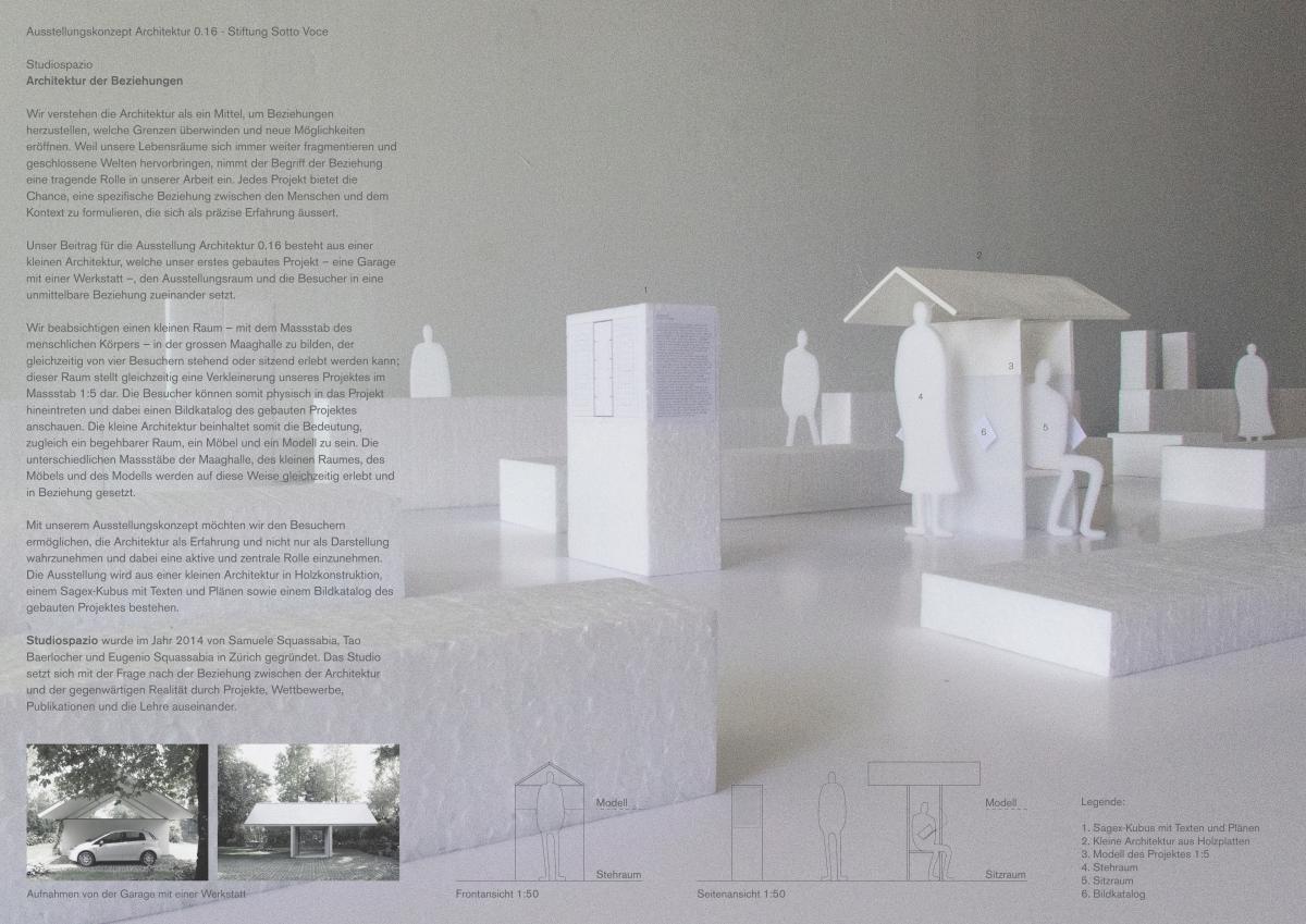Das Zürcher Architekturbüro Studiospazio setzt sich mit der Frage nach der Beziehung zwischen Lebensraum und Umfeld, zwischen dem Menschen und seinem Kontext, auseinander. Ihr erstes gebautes Projekt – eine Garage mit einer Werkstatt - transformieren sie in eine kleine Architektur für die grosse Maag-Halle und machen so die menschlichen Dimensionen spürbar.
